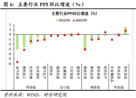 分行业看,原油链拖累加深、煤炭有色链价格多数维持负增长,说明内外部因素共致PPI环比延续负增长,尤其是外部输入性下行压力呈进一步增加的特征。根据统计局测算,本月原油链上的三个行业,包括石油和天然气开采业、精炼石油产品制造业以及化学原料和化学制品制造业价格环比均延续负增长,合计贡献了PPI环比降幅的一半以上;煤炭链和有色链价格环比则多数维持较大幅度的负增长,尤其是建材等非金属制品行业价格环比由正转负,显示出国内投资需求不足尤其是房地产市场需求不足的拖累作用较大(见图6)。