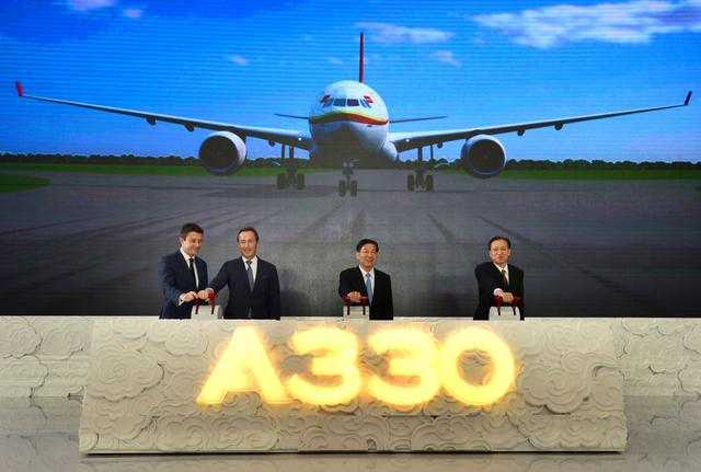 2017年9月20日,空中客车在天津宣布正式启用欧洲以外首个A330宽体机完成和交付中心。一架由空客中欧员工共同完成的A330飞机也在该中心交付给天津航空公司。(新华社记者 张建新 摄)
