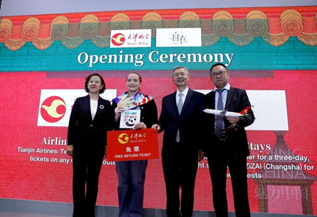 2024年11月6日,在英国伦敦世界旅游交易会中国展区,一名女子获得天津航空免费机票后与现场嘉宾合影。(新华社记者 李颖 摄)
