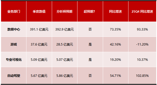 收入37.6亿美元(同比+42.2%),是本季四大板块业务中最大超预期项。主因是RTX50系列显卡驱动份额扩张。同时对比竞争对手 AMD游戏季内收入29.8%的跌幅,显示出随着公司RTX50系列产品的推出,英伟达在独显市场抢占了更多的份额。