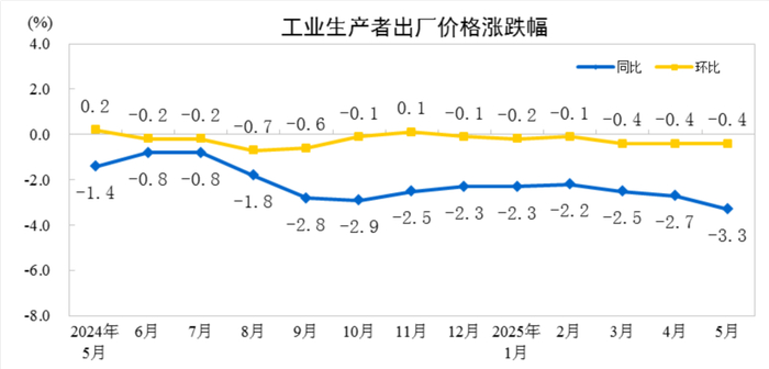5月份,全国工业生产者出厂价格同比下降3.3%,环比下降0.4%;工业生产者购进价格同比下降3.6%,环比下降0.6%。1—5月平均,工业生产者出厂价格和购进价格比上年同期均下降2.6%。