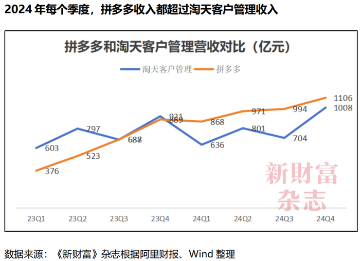 对比来看,早在2023年三季度,拼多多收入就达到688亿元,险胜淘天客户管理的687亿元。随后,除了2023年四季度,其2024年每个季度都力压淘天集团(附图)。
