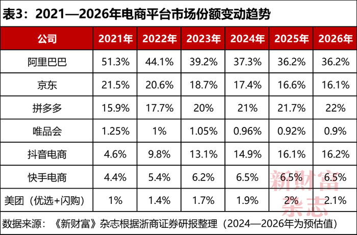 浙商证券预计,2021年,阿里巴巴的市场份额为51.3%,2026年或降至36.2%,同期“抖音+快手”可望从9.2%增加至22.7%,拼多多从15.9%增加至22%,京东从21.5%减少至16.1%,美团(优选+闪购)预计增加1.1个百分点至2.1%,唯品会减少0.35个百分点。单纯从数字上看,差不多是抖快抢走了阿里巴巴的份额,拼多多抢走了京东的份额。