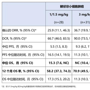 针对免疫耐药的Sq-NSCLC患者,1/1.5 mg/kg剂量组确认的ORR为25.9%,DCR为66.7%,mPFS为5.5个月,mOS为15.3个月,提示IBI363带来潜在长期生存获益;3 mg/kg剂量组观察到更突出的治疗效果:确认的ORR为36.7%、DCR为90.0%、mPFS为9.3个月及OS趋势(中位OS未达到、12个月OS率70.9%)。