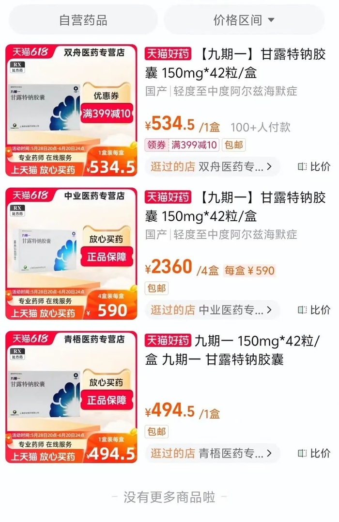 2021年末,甘露特钠胶囊被纳入医保,价格为每盒296元。现在主流的购物平台上,该药物的价格主要在每盒500至600元,也有部分药房一度标出过每盒约5000元的“天价”。
