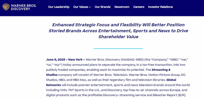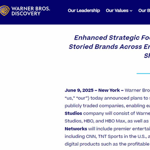 Zaslav发布声明称:“通过未来作为两家独立且优化的公司运营,我们正在赋予这些标志性品牌所需的更精准的专注力和战略灵活性,以便它们能够在当今不断演变的媒体环境中最有效地竞争。”