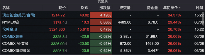 6月9日,盘中现货铂金价格涨超4%,最高触及1221.48美元/盎司,创逾3年以来的新高。截至记者发稿时,现货铂金价格有所回落,但其年内累计涨幅达34.37%,超过现货黄金年内累计涨幅。