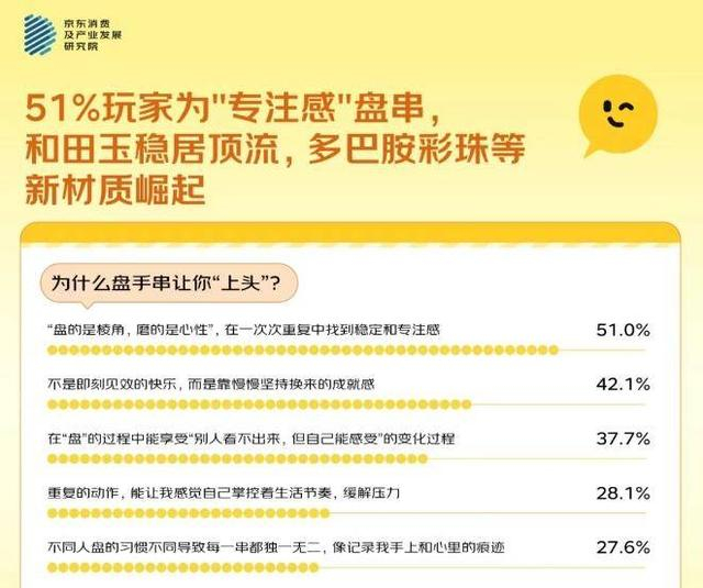 今年6月京东消费及产业发展研究院发布的数据显示,超八成受访成年人拥有自己的小玩具,积木、潮玩盲盒、毛绒玩具、游戏机、文玩手串成为新玩具TOP5。其中,不少年轻文玩手串玩家表示会被塑料、亚克力、金属等材质的制品所吸引。