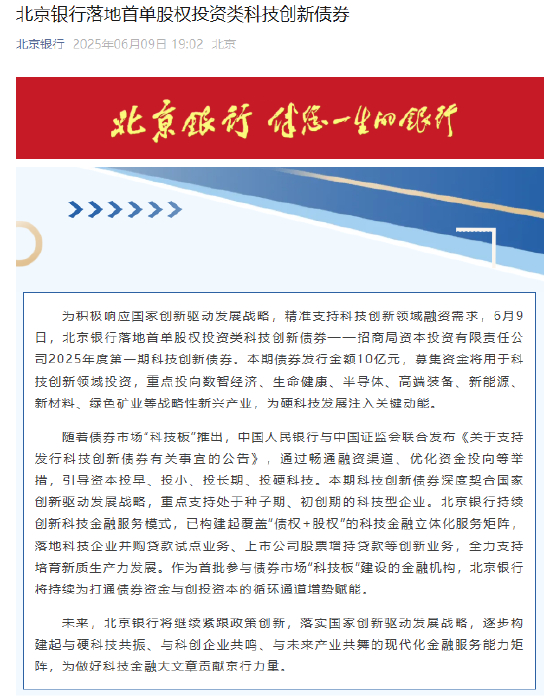 6月9日金融一线消息,据“北京银行”微信公众号,北京银行落地首单股权投资类科技创新债券——招商局资本投资有限责任公司2025年度第一期科技创新债券。本期债券发行金额10亿元,募集资金将用于科技创新领域投资,重点投向数智经济、生命健康、半导体、高端装备、新能源、新材料、绿色矿业等战略性新兴产业,为硬科技发展注入关键动能。