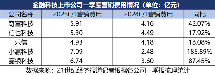 例如小赢科技今年一季度获客与营销费用达到7.09亿元人民币,同比增长185.89%,嘉银科技营销费用6.74%,同比增加87.45%。奇富科技在业绩会演示文稿中提到,今年一季度平台每个获批的用户获客成本从去年一季度的285元飙升到如今的384元。