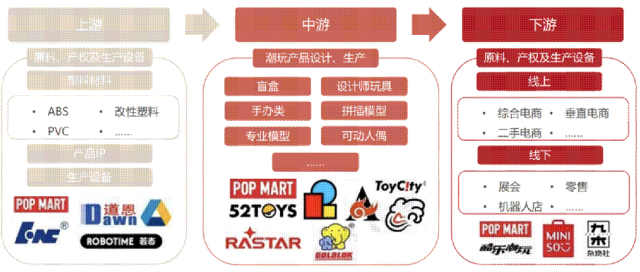 潮玩种类繁多,包括机械模型、手办、公仔、Q版和卡通人物等。生产和销售商不仅限于传统玩具厂商,还包括设计师品牌和艺术品牌等。从产业链来看,国内潮玩上游包括IP设计公司、塑料材料和生产设备供应商,中游为设计制造企业,下游为展会、线下店和电商平台。