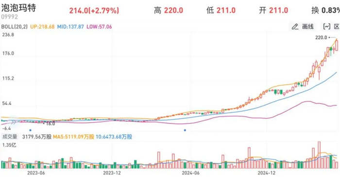 而作为“谷子经济”中的现象级企业泡泡玛特更是业绩飞涨,股价飙升。2024年全年,泡泡玛特实现营收130.4亿元人民币,同比增长106.9%;经调整净利润34.0亿元,同比激增185.9%。截至2025年5月20日,泡泡玛特(09992.HK)股价再创新高,盘中一度达到220港元/股,市值接近3000亿港元。要知道,在2023年的5月20日,泡玛特的股价仅有17.85港元/股。也就是说,仅用2年时间,泡泡玛特的股价就实现了十多倍的增长。
