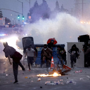 国民警卫队发射催泪弹和橡皮子弹,试图驱散抗议人群;抗议者则投掷水瓶和石块。抗议人数从最初的数十人增加到200人以上,部分抗议者截断了通往洛杉矶市中心的主要高速公路。