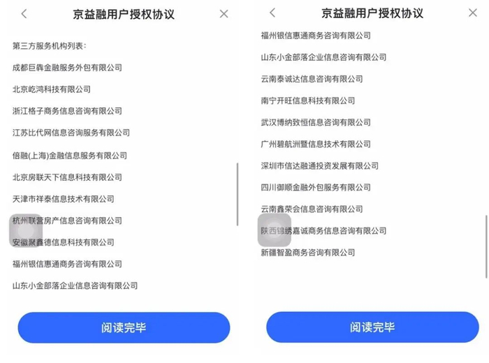 “京益融”产品主要向线下中介导流,协议显示,该产品合作的第三方服务机构共20家,其中包括比代网、四川御顺金融外包服务公司等知名线下贷款中介。