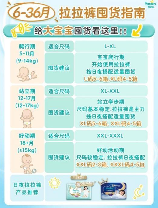 5-11个月:L-XL码,宝宝爬行期开始使用拉拉裤,可以按日夜搭配适量囤货。可以囤L码5-6箱,XL码4-5箱。