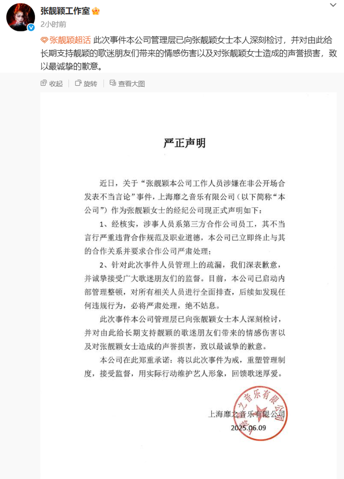 此外,公司管理层已向张靓颖女士本人深刻检讨,并对由此给长期支持靓颖的歌迷朋友们带来的情感伤害以及对张靓颖女士造成的声誉损害,致以最诚挚的歉意。