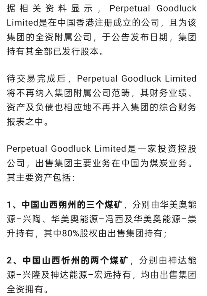 对于此次出售Perpetual Goodluck Limited,中国秦发表示,集团拟考虑透过出售一组从事中国煤炭业务的附属公司而重组业务的可能性,借此专注于更高增长业务,使集团的价值可于有关出售交易后更好地反映。