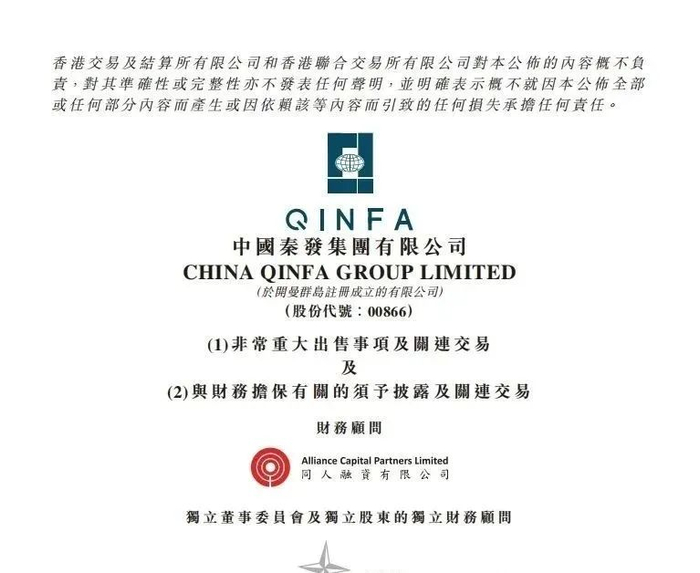 港股上市公司中国秦发发布公告,2025年6月5日,其全资附属公司香港秦发国际贸易有限公司作为卖方,与买方添和集团有限公司签订了买卖协议。根据该协议,香港秦发国际贸易有限公司有条件地同意出售,而添和集团有限公司则有条件地同意购买Perpetual Goodluck Limited全部已发行股份,此次交易的代价为人民币3000万元。