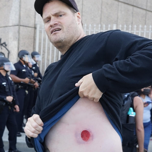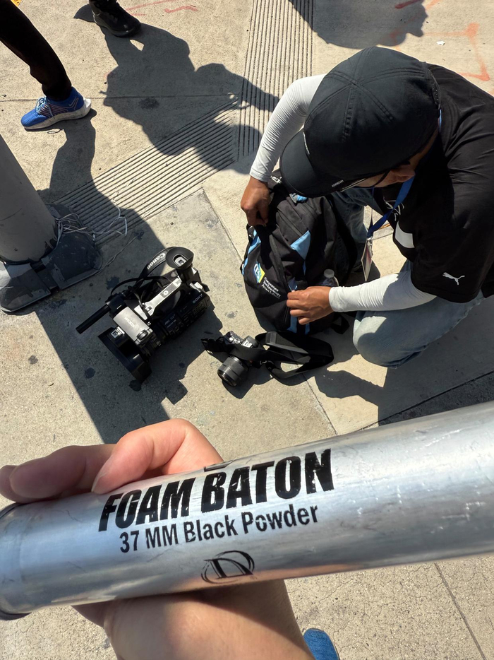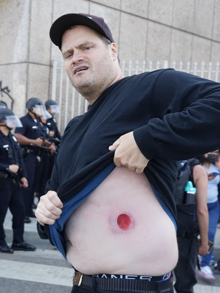 6月8日,在美国加利福尼亚州洛杉矶市中心,一名抗议者展示遭警方枪械击中后留下的伤痕。新华社发(邱晨摄)随着时间推移,联邦拘留中心大楼前及周边地区抗议人士逐渐从早上的数十人增加到下午的数以千计。许多抗议者手持标语牌,高呼口号,要求停止强行遣返移民、保护移民家庭完整等。其间,抗议者多次与军警发生激烈冲突。有示威者向军警队列投掷石块和水瓶等,而军警以橡皮子弹和催泪弹猛烈回击,并以警棍和盾牌开路,冲出警戒线强力驱散抗议人群,不时把个别示威者扑倒在地后逮捕带走。据了解,有数十名示威者当天被捕。
