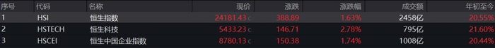 截至6月9日收盘,恒生指数涨1.63%,报收24181.43点;恒生科技指数涨2.78%,报收5433.23点;恒生国企指数涨1.74%,报收8780.13点。