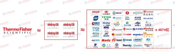 以市值计算,目前国内科学仪器行业的42家上市公司中,排名首位的迈瑞医疗需要扩大四倍,才能与全球巨头赛默飞相当。而若将这42家企业的市值相加,仍与赛默飞存在约4674亿人民币的差距。