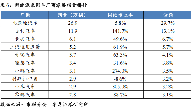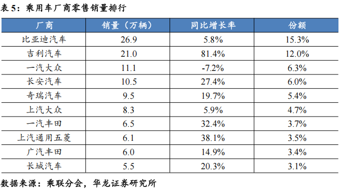 乘用车销量排名前10厂商合计市占率63.4%。分厂商来看,比亚迪汽车/吉利汽车/一汽大众分别以26.9/21.0/11.1万辆分列乘用车零售厂商销量前三位。自主厂商比亚迪汽车/吉利汽车/长安汽车/奇瑞汽车销量同比+5.8%/+81.4%/+27.4%/+19.7%。