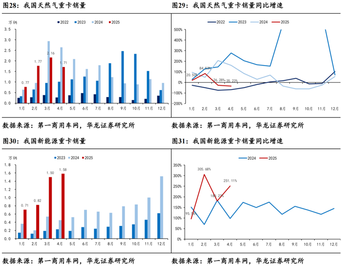 成本优势+补贴倾斜延续新能源重卡高景气度。据第一商用车网数据,2025年4月天然气重卡销量完成1.71万辆,同比-35.23%,环比-20.83%,同比下降主要系2024年同期基数较高;随着各地天然气重卡以旧换新补贴细则逐步出台,叠加LNG价位仍维持低位运行、油气价差下天然气重卡长途运输经济性突显,天然气重卡销量有望维持高位。2025年4月新能源重卡销量完成1.58万辆,同比+251.11%,环比+5.33%,上游碳酸锂价格下降带动终端产品降价,叠加运营成本优势以及营运车辆补贴额度倾斜,新能源重卡景气度有望延续。