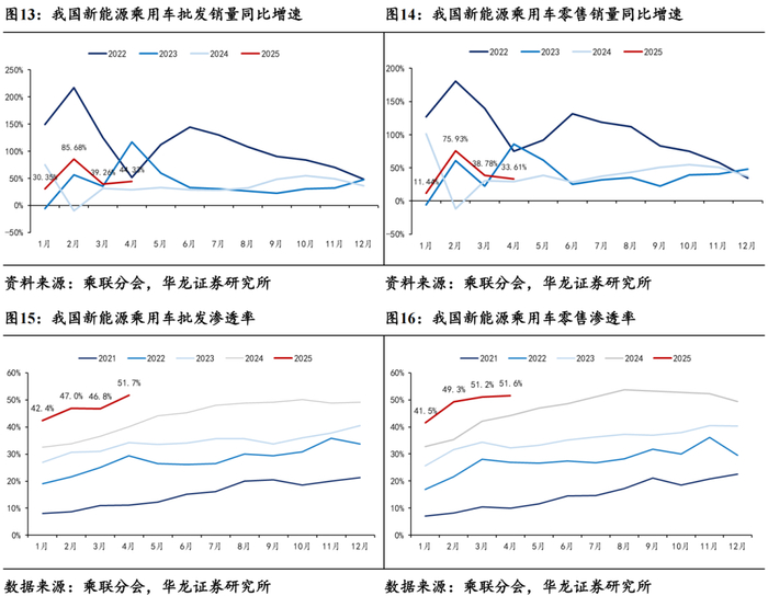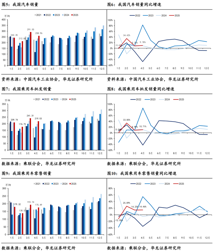 4月乘用车零售销量同比+14.46%。据中汽协数据,2025年4月,我国汽车销售完成258.96万辆,同比+9.78%,环比-11.18%。据乘联分会数据,2025年4月乘用车批发销量完成219.03万辆,同比+10.71%,环比-9.23%,乘用车零售销量完成175.49万辆,同比+14.46%,环比-9.42%。在国家促消费政策推动下,很多省市出台并逐步落实了相应的促消费政策,叠加主机厂厂补加码、金融支持、车展等线下活动的全面启动,4月车市走势良好。随着春节前的燃油车消费潮转为节后的新能源消费潮,新能源渗透率持续提升,新能源车成为春季乘用车市场恢复的主要驱动力。