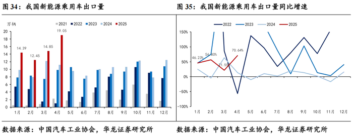 4月乘用车出口同比微增0.44%。据中汽协数据,2025年4月乘用车出口销量完成43.10万辆,同比+0.44%,环比+5.03%。其中新能源乘用车出口销量完成19.05万辆,同比+70.64%,环比+28.21%。新能源乘用车出口增长的主要动力,一方面欧洲、东南亚和南美等市场对中国新能源乘用车,特别是插混车型接受程度提升,另一方面比亚迪、奇瑞和吉利等车企加大海外拓展力度,推动出口销量提升。