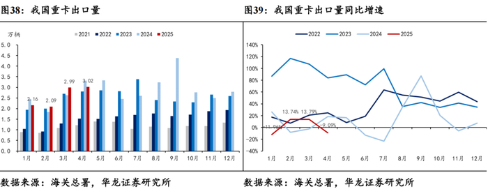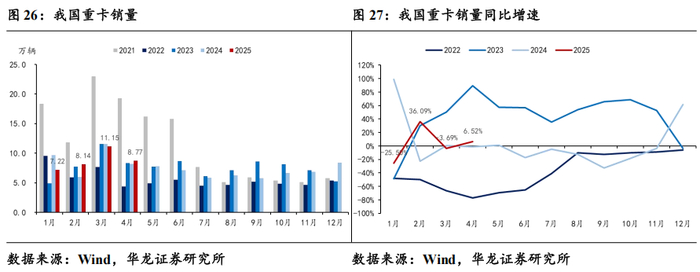 供需关系改善下重卡销量同比复苏。重卡方面,据Wind数据,2025年4月重卡销量完成8.77万辆,同比+6.52%,环比-21.36%。前期重卡市场销量波动导致经销商和车企库存处于相对合理的调整周期,到4月份,库存水平趋于合理,市场供需关系改善,车企根据市场需求合理排产,经销商积极促销,推动了重卡销量增长。