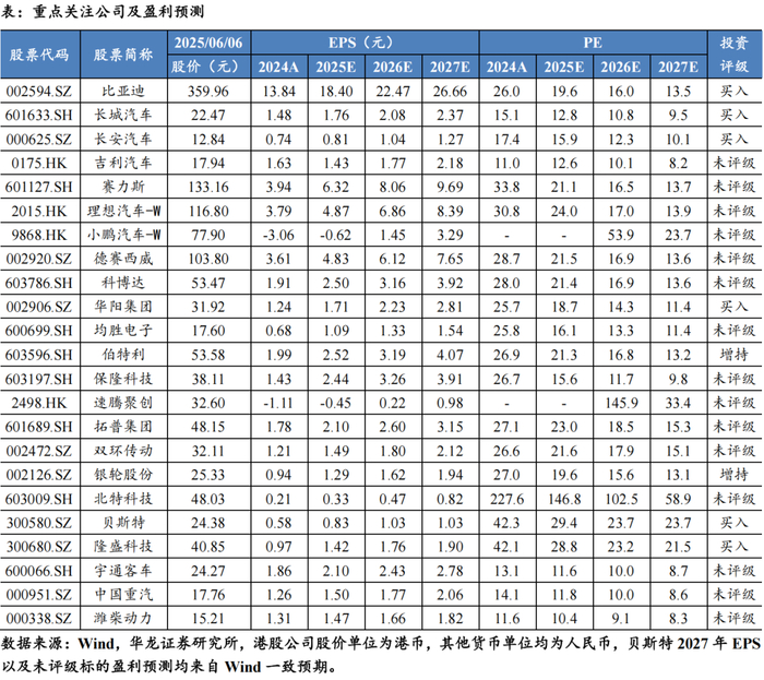 兵装集团旗下汽车业务将独立成为新汽车央企,乘用车行业整合节奏加速,维持行业“推荐”评级。个股方面,建议关注:(1)智驾领先整车标的比亚迪,长安汽车,长城汽车,吉利汽车,赛力斯,理想汽车-W,小鹏汽车-W等;(2)智能化核心环节标的德赛西威,科博达,华阳集团,均胜电子,伯特利,保隆科技,速腾聚创,拓普集团,双环传动,北特科技,贝斯特,隆盛科技等;(3)商用车建议关注客车&重卡龙头宇通客车,中国重汽,潍柴动力等。