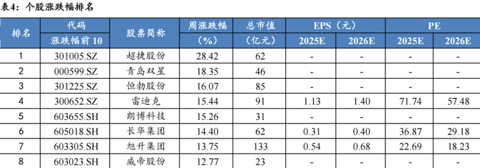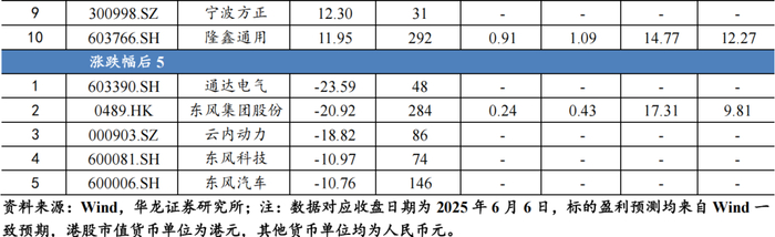 个股方面,本周175只个股上涨,134只个股下跌,涨跌幅前五的个股为超捷股份(+28.42%),青岛双星(+18.35%),恒勃股份(+16.07%),雷迪克(+15.44%),朗博科技(+15.26%);涨跌幅后五的个股为通达电气(-23.59%),东风集团股份(-20.92%),云内动力(-18.82%),东风科技(-10.97%),东风汽车(-10.76%)。
