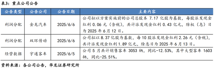 本周行情:申万汽车涨跌幅跑输沪深300指数0.71pct。2025年6月3日至6月6日,沪深300指数涨跌幅+0.88%,申万汽车板块涨跌幅+0.17%,其中乘用车/商用车/汽车零部件/汽车服务涨跌幅+0.83%/-5.35%/+0.28%/+1.15%。截至2025年6月6日,申万汽车板块PE(TTM)26.0倍,较上周环比基本持平。