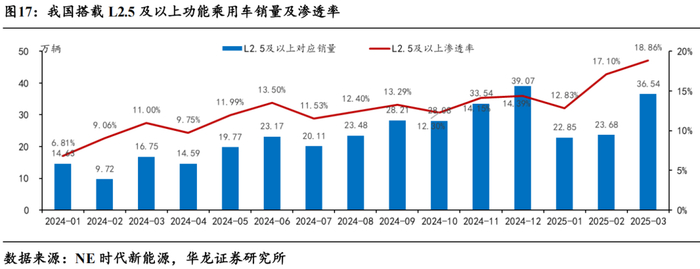 2025年3月L2.5及以上智驾渗透率达18.86%。据NE时代新能源数据,2025年3月搭载L2.5及以上智驾系统乘用车零售销量达36.54万辆,渗透率18.86%。2025年搭载L2.5及以上智驾系统乘用车累计销量83.07万辆,累计渗透率16.79%。随着传统自主车企等逐步将高速/城区NOA等高阶智驾功能下放至10万元级别车型,2025年L2.5及以上渗透率有望快速提升。