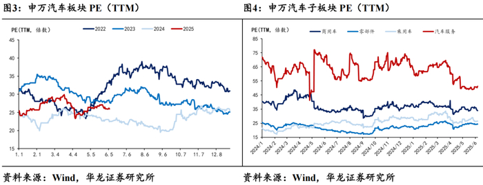 估值方面,截至2025年6月6日收盘,申万汽车板块PE为26.0倍, 较上周环比基本持平。子板块中,乘用车/商用车/汽车零部件/汽车服务板块PE为26.4/33.8/24.2/51.3倍。