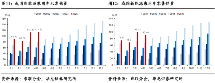 4月新能源零售销量90.46万辆,零售渗透率51.6%。据乘联分会数据,2025年4月新能源乘用车批发销量完成113.30万辆,同比+44.33%,环比+50.00%,批发渗透率51.7%,同比+11.66pct,环比+4.99pct;新能源乘用车零售销量完成90.46万辆,同比+33.61%,环比-8.74%,零售渗透率51.6%,同比+7.39pct,环比+0.39pct。随着主流新能源车型补能效率提升&智驾功能升级,新能源渗透率在相对竞争力优势的推动下持续提升。2025Q1新能源渗透率47.3%,同比+10.66pct。
