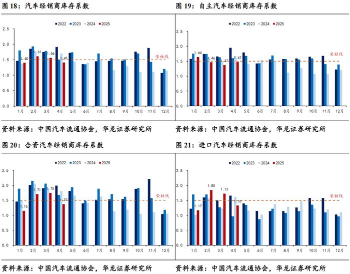 4月库存水平处于合理区间。据中国汽车流通协会数据,2025年4月份汽车经销商综合库存系数为1.41,同比-17.06%,环比-9.62%。其中自主品牌库存系数为1.47,同比-11.98%,环比+7.30%;合资品牌库存系数为1.37,同比-24.31%,环比-21.71%;进口品牌库存系数为1.33,同比-17.90%,环比-23.12%。