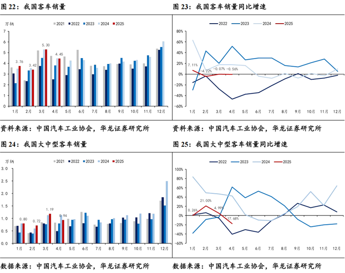 4月客车销量同比微降。客车方面,据中汽协数据,2025年4月客车销量完成4.45万辆,同比-0.56%,环比-16.05%。2025年4月,大中型客车销量完成0.94万辆,同比-17.68%,环比-20.88%。大中型客车销量同环比双双下滑主要原因有二:一是2024年8月以来实施的以旧换新政策一定程度上透支市场需求;二是每年3月作为新能源客车营运企业招标采购旺季,一定程度上透支4月市场需求。