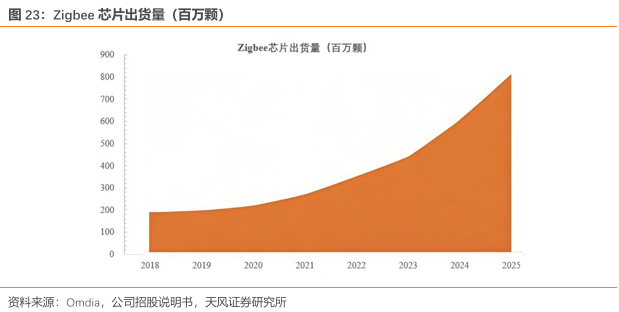ZigBee是一种基于 IEEE802.15.4 标准,在以 2.4GHz 为主要频段进行传输的无线通信技术。ZigBee 技术是物联网无线连接技术的典型代表,凭借超低功耗、安全性较高的独特优势,广泛应用于家庭自动化、无线传感器网络、工业控制系统、环境监控、医疗数据收集、楼宇自动化等特定领域的场景应用。ZigBee 无线连接芯片在 2020 年迎来了迅猛发展,推出了560 多款经过认证的设备,ZigBee 占到智能家居物联网传感器网络芯片市场的三分之一以上,市场前景广阔。根据Omdia预计ZigBee芯片出货量将于2025 年突破 8 亿颗。