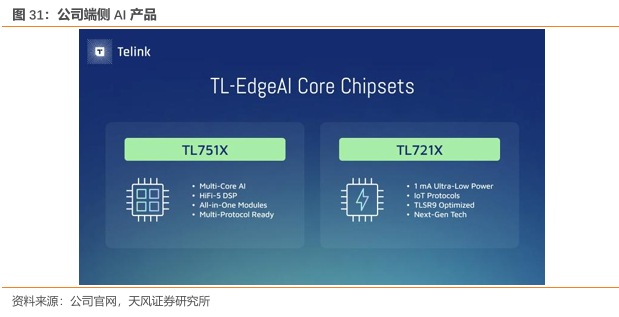 端侧AI芯片布局:推出AI芯片布局连接+计算双领域,成为高壁垒第二增长曲线。公司在2024年推出TL721X系列AI芯片及TLEdgeAI-DK开发平台,集成边缘AI计算、RISC-V架构、Matter协议,产品支持谷歌LiteRT等开源模型,具备功耗低等竞争优势。商业化落地方面,公司音频端AI率先量产,赋能智能耳机产品,同时拓展智能穿戴、运动监测、汽车防盗器、Matter智能家居等场景,2025年多项目有量产机会。