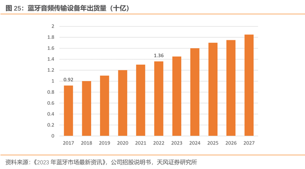 根据国际蓝牙技术联盟统计,全球蓝牙音频传输设备出货量目前已经从2017 年的9.2 亿个持续增长至2022 年的 13.6 亿个。2027 年蓝牙音频传输设备年出货量相比2022 年预计将增长35.29%,年复合增长率逾 6%。凭借蓝牙音频的下游应用市场的不断扩张,尤其是 TWS 耳机迅速的需求增长,蓝牙音频芯片的市场需求也不断上涨。