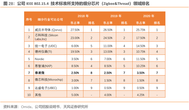 公司多模协议芯片出货量处于全球领先地位。Omdia对于同时支持 Bluetooth LE 和 IEEE 802.15.4 技术标准的多模芯片市场进行了统计,数据显示,2019 年度和2020 年度公司在上述细分领域的市占率分别为6.00%和 5.00%,居全球前五。公司还在 2.4G 私有协议SoC 领域取得领先地位,特别是在无线和AI人机交互设备(HID)、智能零售电子货架标签(ESL)为代表的主要应用市场。