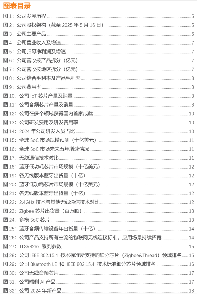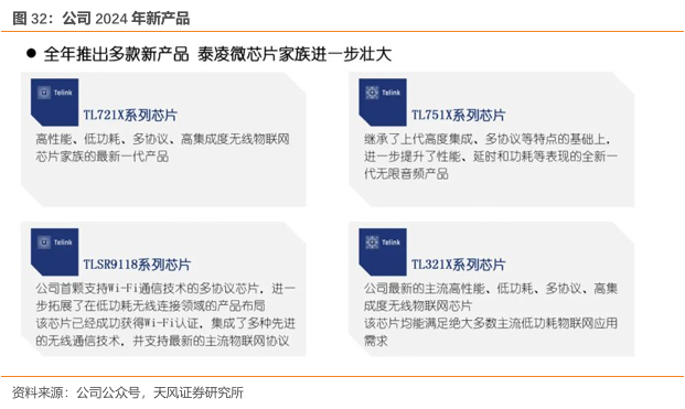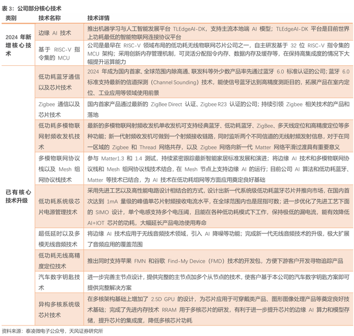 技术突破上,2024年公司斩获多项国内首创:首发峰值电流 1mA 量级的多模低功耗物联网芯片;首发通过蓝牙 6.0 高精度定位标准认证的最新蓝牙芯片;首家获得 Zigbee Direct、Zigbee R23 认证的企业。2024 年,公司推出两款端侧 AI 芯片及全球功耗最低的智能物联网连接协议平台 TLEdgeAI-DK,集成了端侧计算单元与多协议无线通讯能力,标志着公司正式步入“连接+算力”的 AIoT 时代。