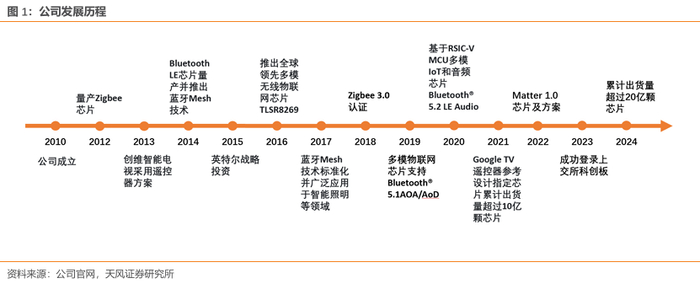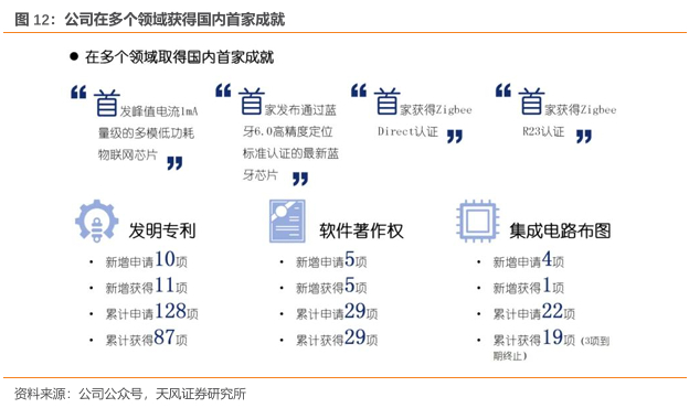 公司研发出国内第一款多模低功耗物联网无线连接系统级芯片。在多模物联网无线连接领域和蓝牙领域,2016年公司开创性地研发出国内第一款多模低功耗物联网无线连接系统级芯片 TLSR8269,是继德州仪器(TI)cc2650 型号芯片之后全球第二款多模低功耗物联网无线连接芯片。2019年7月,公司获选为国际蓝牙技术联盟(SIG)董事会成员公司,与同为成员公司的国际知名科技公司苹果、爱立信、英特尔、微软、摩托罗拉移动、诺基亚和东芝一起负责蓝牙技术联盟的管理和运营决策;公司副总经理、核心技术人员金海鹏博士被聘请为SIG董事会联盟成员董事,深度参与国际蓝牙标准的制定与规范,积极推动蓝牙技术的发展。
