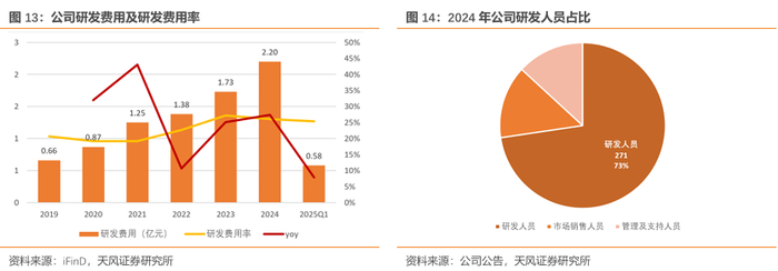 公司保持高水平研发投入,研发团队持续壮大。2024年,公司研发费用达2.20 亿元,占营收比重超26%,费用相比2023年度同期增幅27.35%,近三年累计投入5.31 亿元。2024年,公司研发人员271人,占公司全员工比例73%。公司持续以高强度研发构建技术壁垒,确保公司核心竞争力提升。