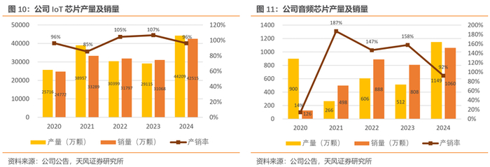 公司芯片累计出货量超20亿颗。公司IoT芯片产销量稳步增长,2024年产量达4.42亿颗。音频芯片产量从2020年900万颗增至2024年1149万颗。