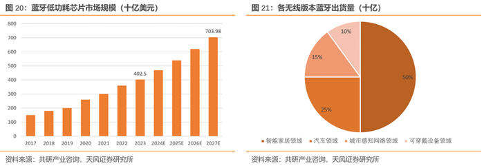 据共研产业咨询数据,2023年我国低功耗蓝牙芯片市场规模为402.5亿元,预计2027年低功耗蓝牙芯片市场规模将达到703.98亿元。按应用领域来看,智能家居领域市场规模占比50%,汽车领域市场规模占比25%,城市感知网络领域市场规模占比15%,可穿戴设备领域市场规模占比10%。