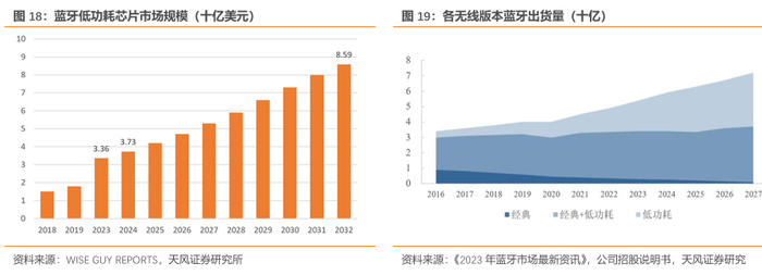 低功耗蓝牙芯片市场增长迅猛。据WISE GUY REPORTS统计,2023年蓝牙低功耗芯片市场规模预计为33.6亿美元,预计到2032年增长到85.9亿美元,2024-2032CAGR约为11.01%。国际蓝牙技术联盟预计,经典蓝牙、低功耗蓝牙及双模蓝牙无线连接技术的出货量总金额在未来五年将大幅上涨。