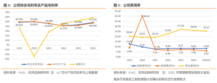 产品盈利能力持续增强。公司营收以IoT芯片为主,因此综合毛利率与IoT芯片毛利率高度重合。公司毛利率整体呈现回升态势,2025年综合毛利率回升至48.34%,其中IoT芯片毛利率47.17%,音频芯片毛利率显著提升至58.36%。公司费用结构持续优化,销售/管理费率稳定在8%、7%左右,公司研发持续投入。