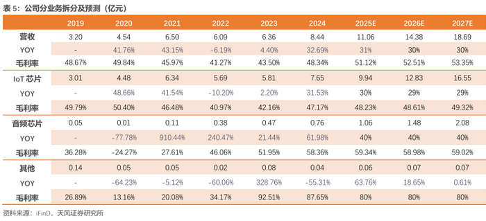 公司营收以IoT芯片为主导。IoT芯片收入持续增长,IoT芯片2024年收入7.65亿元(+ 31.53% yoy)。音频芯片2024年收入0.76亿元(+61.98% yoy),受益于现有客户订货量的增长和Sony、蜂语、猛玛等新品牌客户的拓展和量产,公司音频收入大幅增长。
